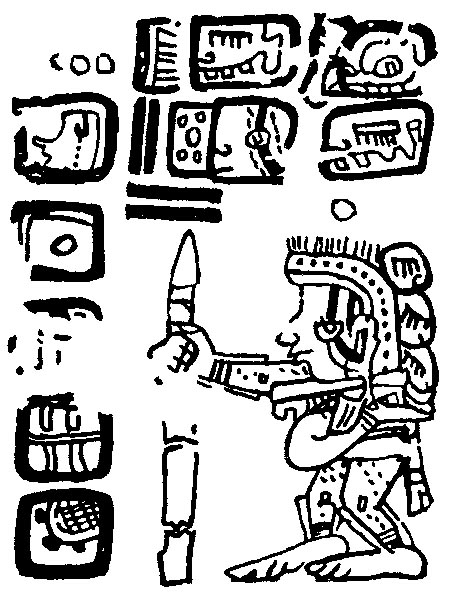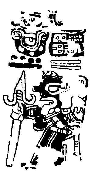 ![]() The underworld god Kisin is pictured, walking with a spear in one hand and three Kimi glyphs (skulls) on his back. Drawing after Villacorta C. and Villacorta (1976:328). | Themes carrying weapon(s) |