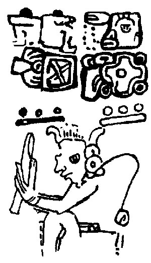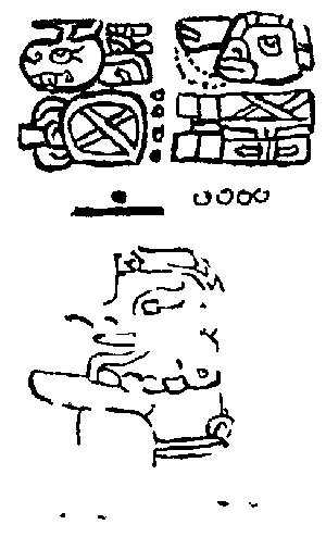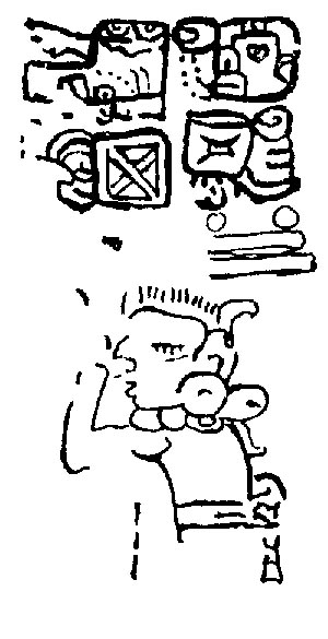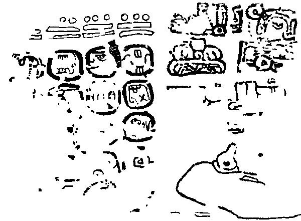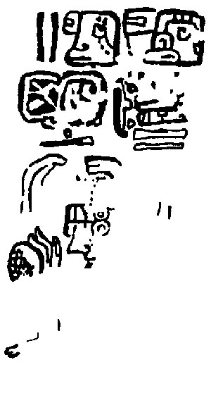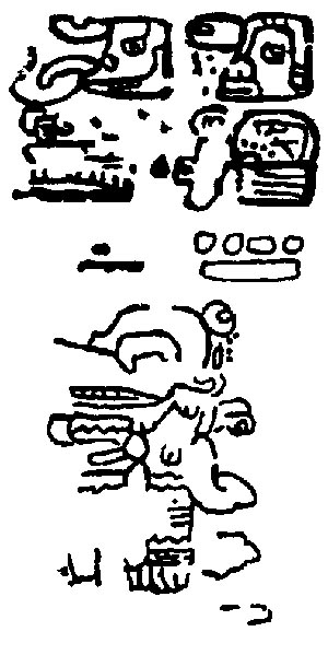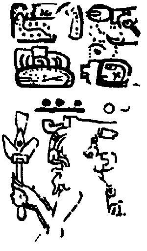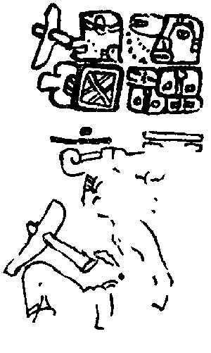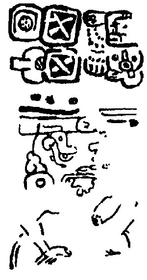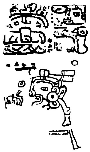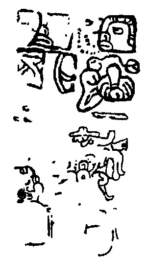 ![]() K'uh (God C) is pictured, but the frame is substantially eroded, so it is impossible to see what he is doing. Drawing after Villacorta C. and Villacorta (1976:340). | Themes captive? |