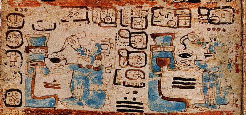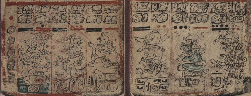 An alternate way of interpreting almanacs such as this one that include a series of frames with repetitive iconography (i.e., in which the activity remains the same but the deity changes) is proposed by Vail. She points out that the traditional model fails to take into account the fact that the use of blue paint to consecrate a house or structure has specific ritual correlates described in Bishop Landa’s account Relación de las cosas de Yucatan (written in the 1560s). A careful reading of Landa’s text suggests that blue paint was associated with ceremonies celebrated in conjunction with the 365-day haab', rather than with the tzolk'in calendar. This suggests to Vail that this almanac, as well as a number of other 5 x 52-day almanacs with similar iconography in each frame, refers to the repetition of haab' rituals over the course of a 52-year Calendar Round cycle. Codical almanacs such as those illustrated above, therefore, allowed Maya priests or daykeepers to schedule the same haab' ritual for a series of years over the course of a 52-year period. For more information about how this was accomplished, Vail (2002, 2004) offers a detailed discussion.