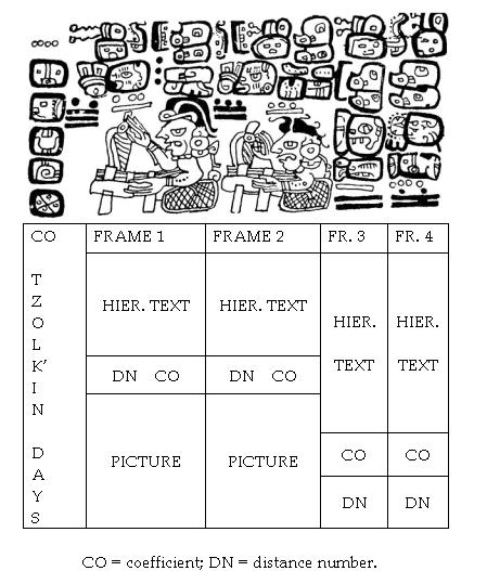 The calendrical information contained in an almanac appears in a very abbreviated form. The only information given explicitly consists of the initial dates in each row (which appear in the tzolk'in column at the beginning of the almanac). Together with the distance numbers and coefficients, this information allows the reader to determine the complete calendrical structure of an almanac.