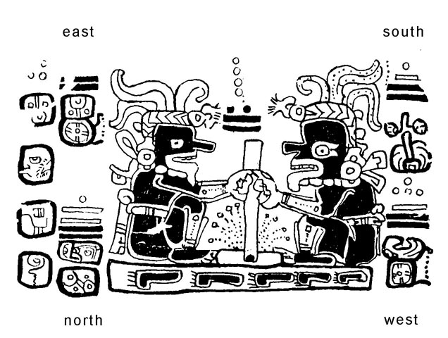 Not all almanacs in the Maya codices are formatted in terms of an initial column of tzolk'in dates followed by discrete frames associated with a single distance number and coefficient. Three other structural types occur fairly commonly in the Madrid Codex—circular, crossover, and in extenso almanacs. Circular almanacs generally include a central picture with a series of distance numbers and coefficients placed around the image. In the example illustrated here, what would be presented as five separate frames in a more standard almanac format are reduced to one picture and four abbreviated hieroglyphic captions referring to the world directions.